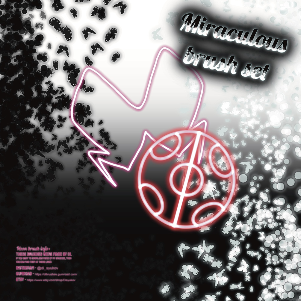 A free set of Miraculous Ladybug themed brushes. The dark titled ones- Fly Away, Little Akuma and Akuma Gloom, look best with dark colors, and the light titled ones- Bye Bye, Little Butterfly and Time to be-Evilize, look best with light colors. The neon brush used on the thumbnail image is by Di, and can be found at brushes.gumroad.com, and the actual symbol for ladybug was seen at https://pin.it/2EnkTfJ There are 4 brushes in the set, and I have given some examples of how I intended they be used, but maybe you have other uses for them! Also, I drew a bad Ladybug. Lol. Made with Brush Studio in Procreate 5.2. Enjoy!